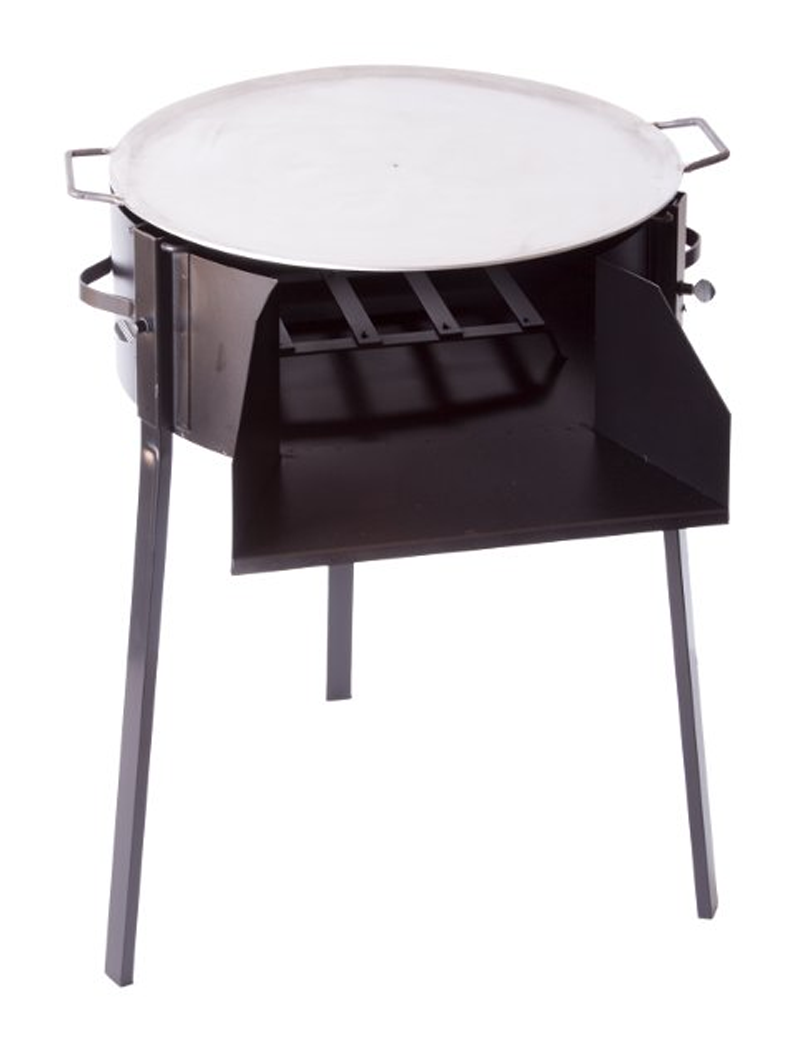 Descripción. Son las conocidas como Barbacoas-Paellero que sirven para cocinar paellas y otros platos que necesitan ser cocinados en sartenes redondas y a leña. Medidas: (diámetro x profundidad x altura total incluyendo las patas) 50x17x73