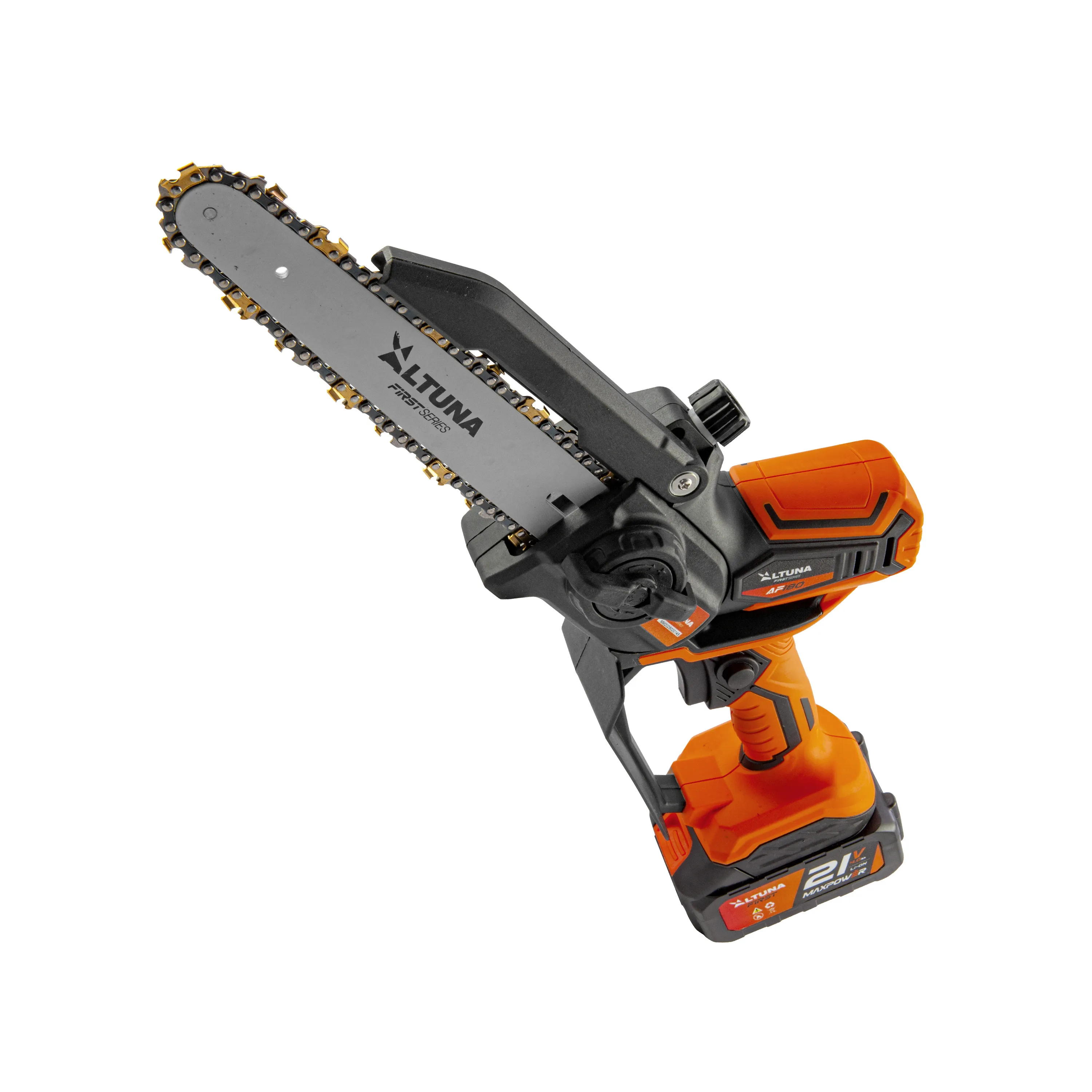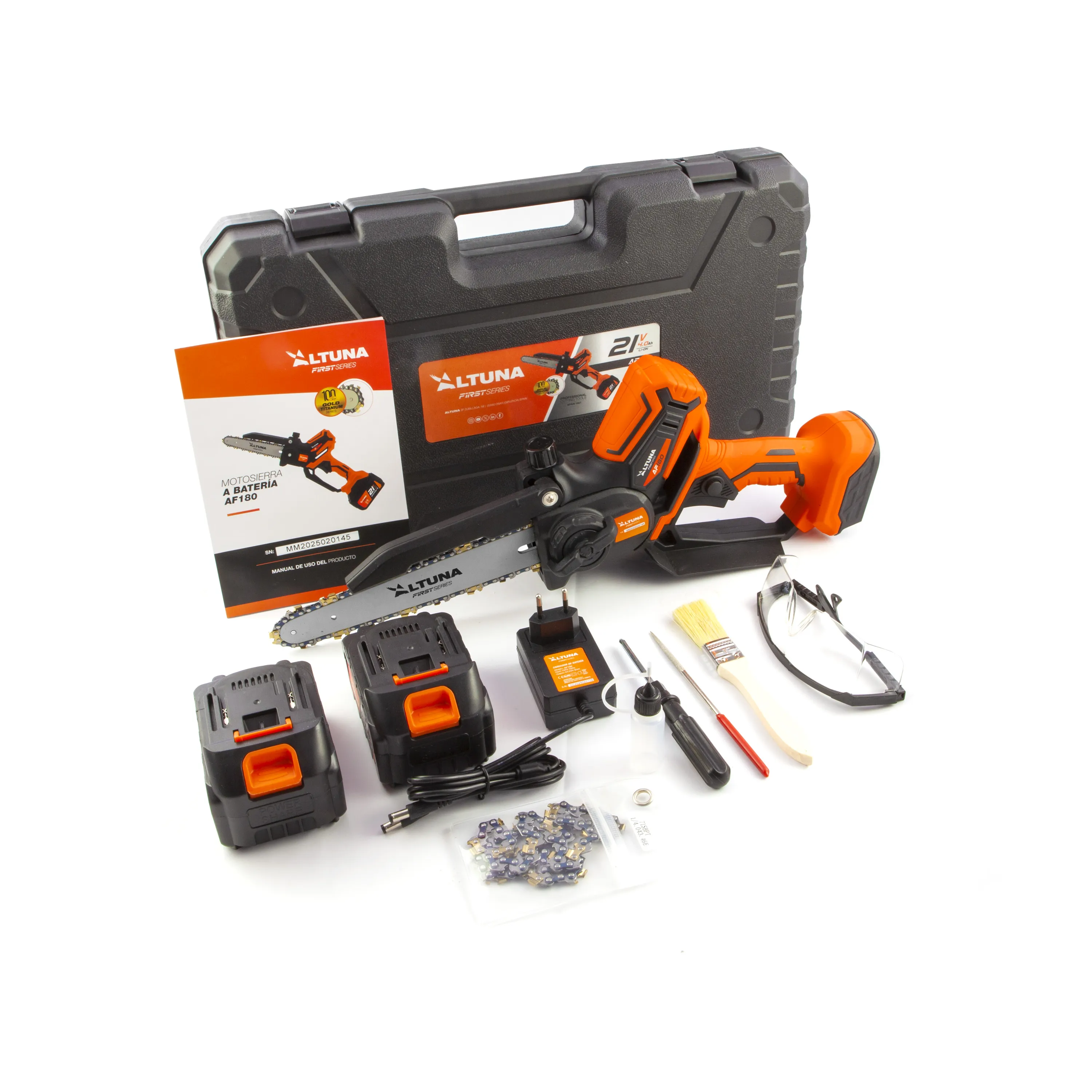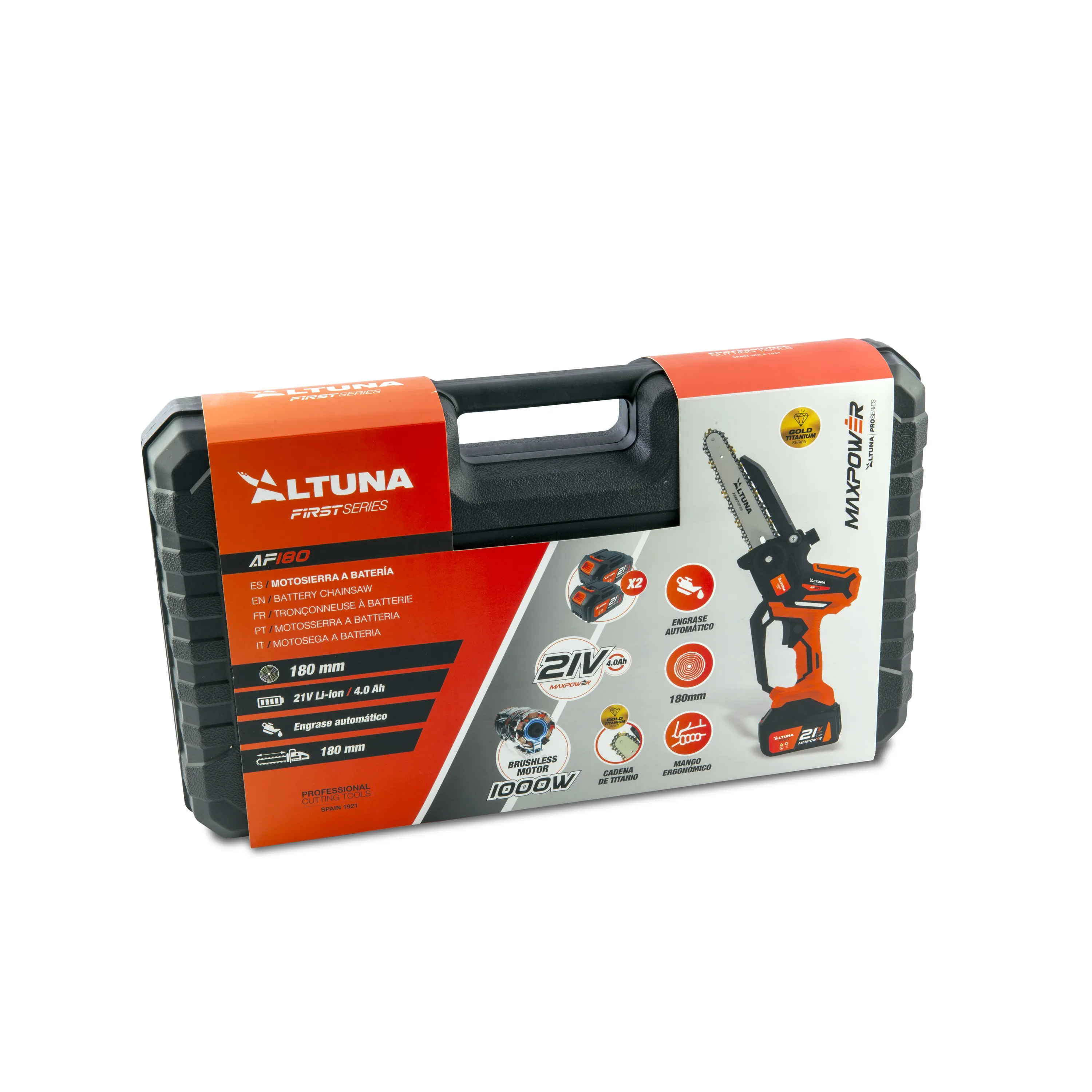 Motosierra eléctrica ALTUNA AF180, sin cables, con motor brushless de 800 W, batería de 21 V y 4.0 Ah y cadena de titanio. Capacidad de corte de hasta 180 mm para poda auxiliar y jardinería.