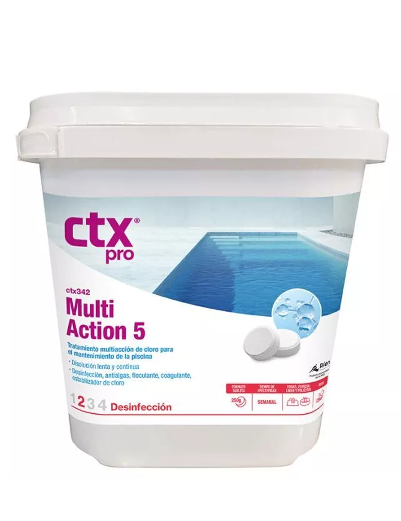 Tratamiento de cloro multiacción para el mantenimiento de piscinas.