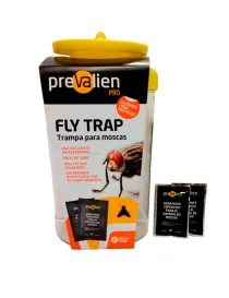 Trampa para capturar la mosca doméstica o común. La mezcla de atrayentes llama a las moscas a entrar en la trampa y el diseño específico del envase no les permite salir.