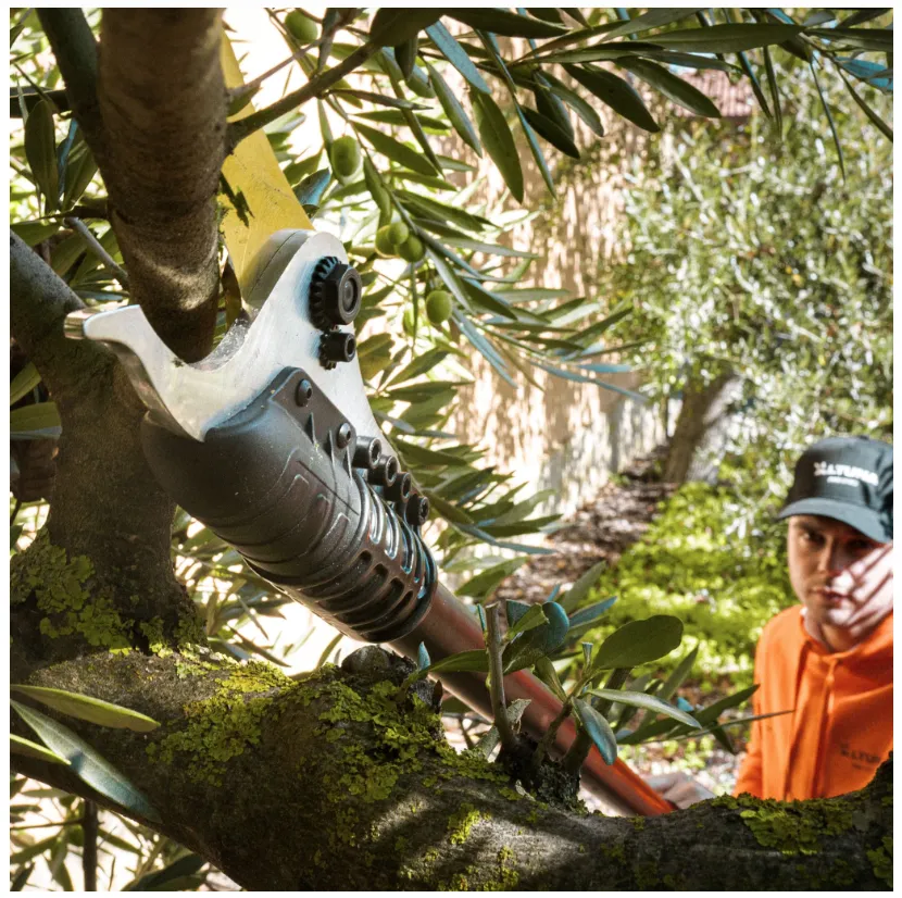 Tijera de poda eléctrica con pértiga ALTUNA AB2000 con motor brushless de 720W, corte progresivo y cuchilla de titanio. Doble batería de 25,2V – 2,5Ah, capacidad de corte de hasta 50 mm y altura máxima de 220 cm. Potencia y precisión para poda en altura.