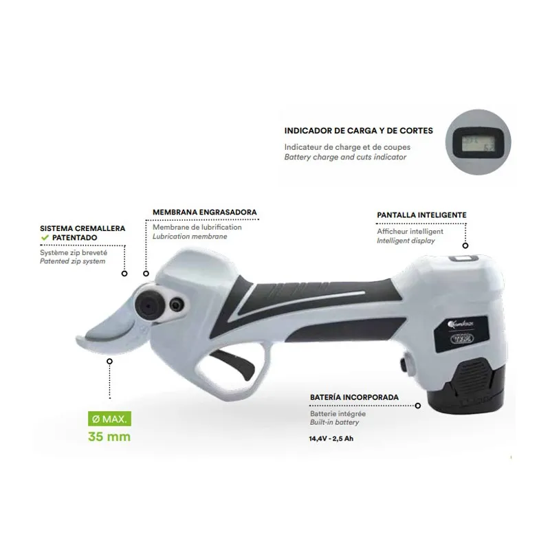 Esta tijera de poda eléctrica es recomendada para su utilización en agricultura, jardinería y paisajismo.