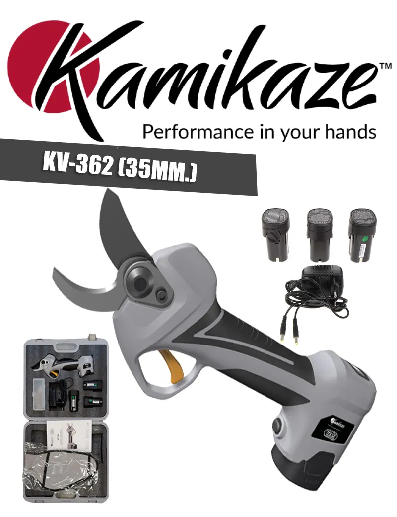 La tijera de poda kamikaze eléctrica KV 362 para uso profesional, tiene un peso reducido de solo 1,05kg además sus baterías dura cada una alrededor de las 2-3h, entre sus características destaca el corte progresivo y la posibilidad de cambiar su apertura siendo la máxima capacidad de corte 35mm.